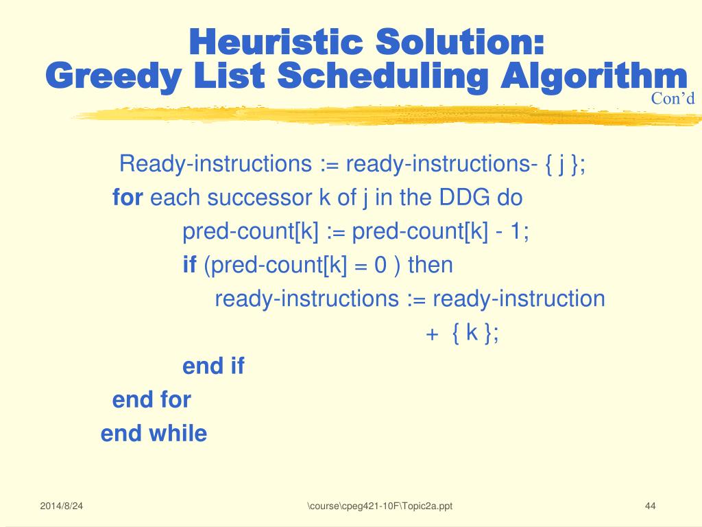 Heuristic Solution:Greedy List Scheduling Algorithm Con’d Ready-instructions := ready-instructions- { j }; for each successor k of j in the DDG do pred-count[k] := pred-count[k] - 1; if (pred-count[k] = 0 ) then ready-instructions := ready-instruction + { k }; end if end for end while \course\cpeg421-10F\Topic2a.ppt