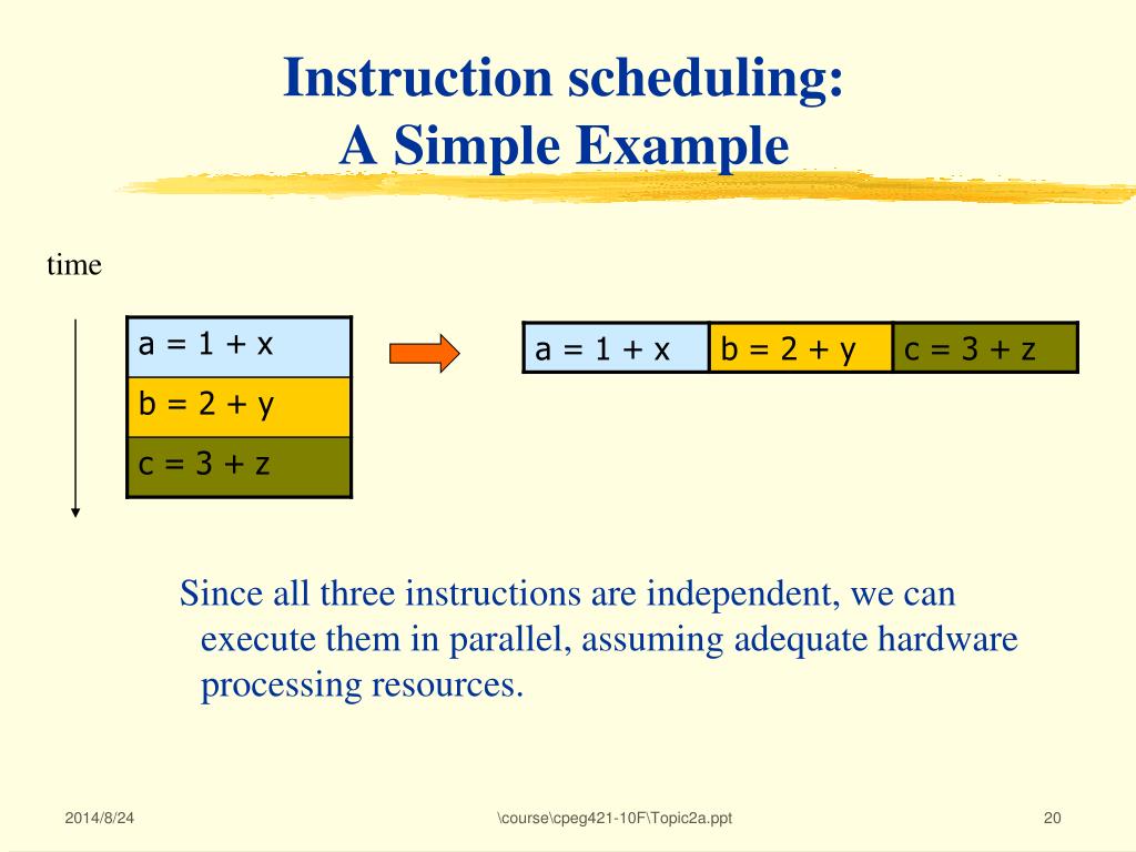 Instruction scheduling:A Simple Example time Since all three instructions are independent, we can execute them in parallel, assuming adequate hardware processing resources. \course\cpeg421-10F\Topic2a.ppt