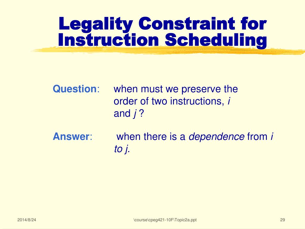 Legality Constraint for Instruction Scheduling Question: when must we preserve the order of two instructions, i and j ? Answer: when there is a dependence from i to j. \course\cpeg421-10F\Topic2a.ppt