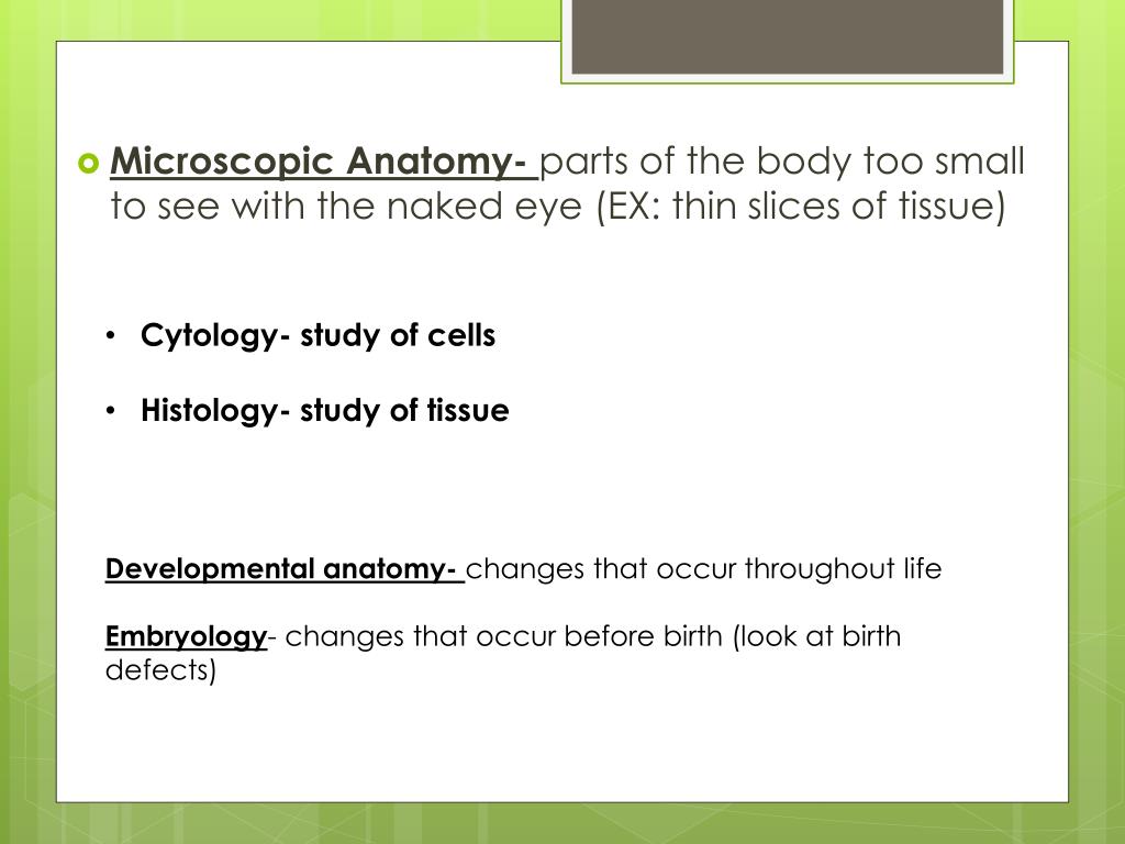 Microscopic Anatomy- parts of the body too small to see with the naked eye (EX: thin slices of tissue) • Cytology- study of cells • Histology- study of tissue Developmental anatomy- changes that occur throughout life Embryology- changes that occur before birth (look at birth defects)