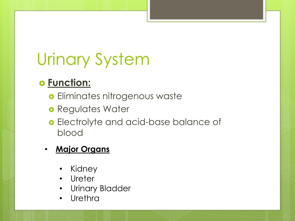 Urinary System • Function: • Eliminates nitrogenous waste • Regulates Water • Electrolyte and acid-base balance of blood • Major Organs • Kidney • Ureter • Urinary Bladder • Urethra