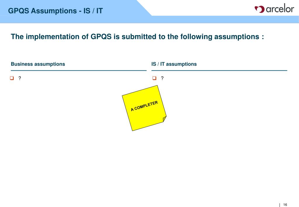 GPQS Scope - Business Location Organisation Business Process • X • Product Line Management • Pilot : three plants • Dunkerque • Florange • Aviles • Roll-out In Scope • Final decision systems : supply of information only • X • X A COMPLETER Out of scope