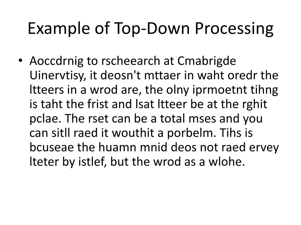 Example of Top-Down Processing • Aoccdrnig to rscheearch at Cmabrigde Uinervtisy, it deosn't mttaer in waht oredr the ltteers in a wrod are, the olny iprmoetnt tihng is taht the frist and lsat ltteer be at the rghit pclae. The rset can be a total mses and you can sitll raed it wouthit a porbelm. Tihs is bcuseae the huamn mnid deos not raed ervey lteter by istlef, but the wrod as a wlohe.
