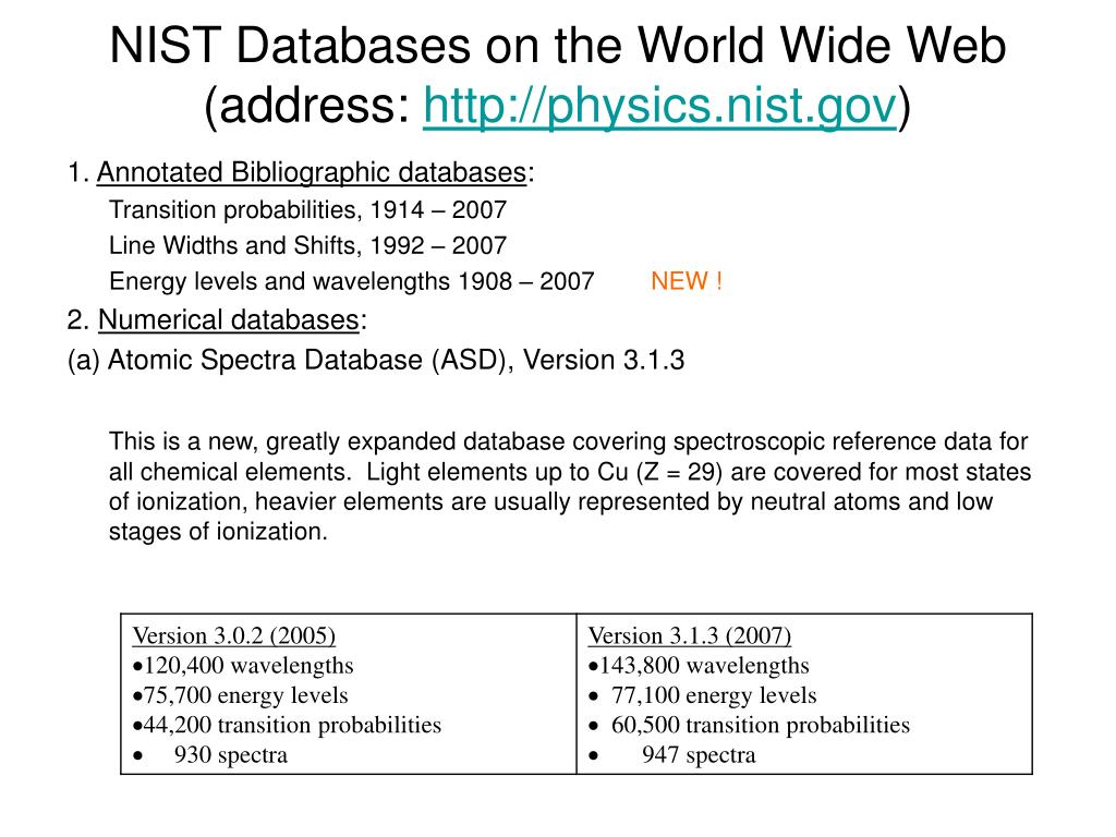 NIST Databases on the World Wide Web (address: http://physics.nist.gov) 1. Annotated Bibliographic databases: Transition probabilities, 1914 – 2007 Line Widths and Shifts, 1992 – 2007 Energy levels and wavelengths 1908 – 2007 NEW ! 2. Numerical databases: (a) Atomic Spectra Database (ASD), Version 3.1.3 This is a new, greatly expanded database covering spectroscopic reference data for all chemical elements. Light elements up to Cu (Z = 29) are covered for most states of ionization, heavier elements are usually represented by neutral atoms and low stages of ionization.