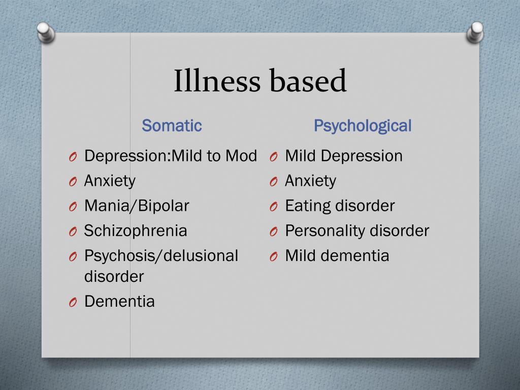 Illness based Psychological Depression:Mild to Mod Anxiety Mania/Bipolar Schizophrenia Psychosis/delusional disorder Dementia Mild Depression Anxiety Eating disorder Personality disorder Mild dementia Somatic