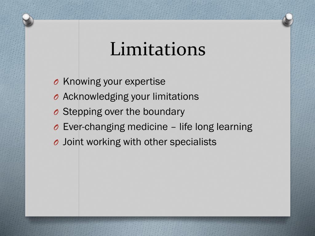 Limitations • Knowing your expertise • Acknowledging your limitations • Stepping over the boundary • Ever-changing medicine – life long learning • Joint working with other specialists