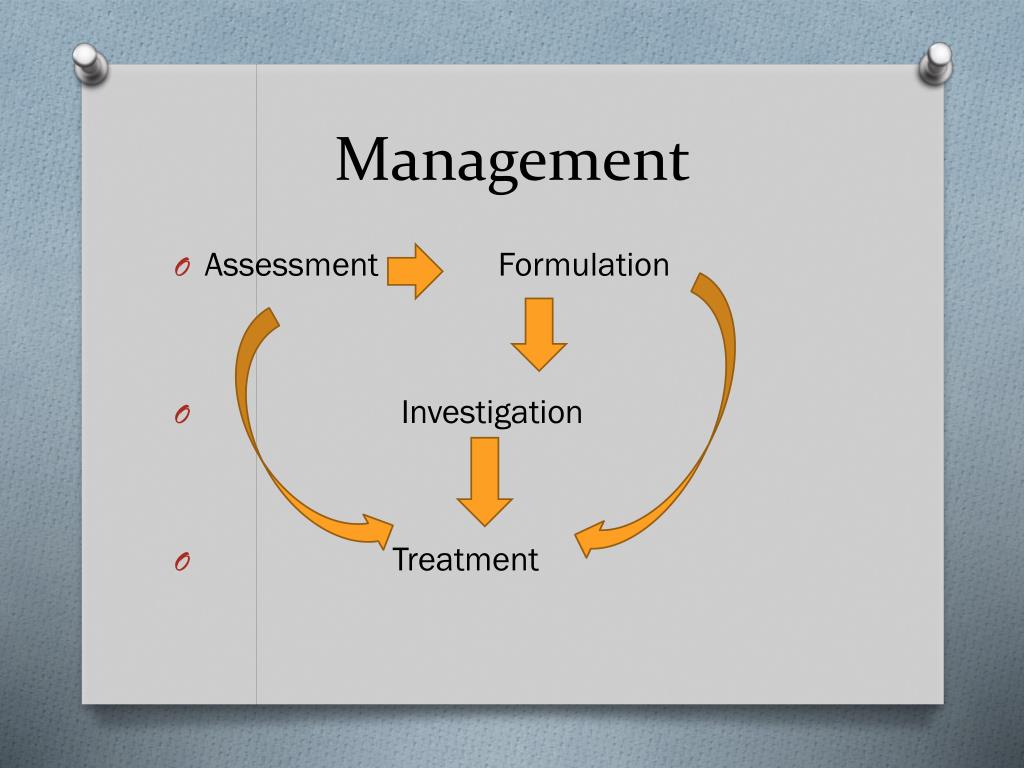 General Management principles- Investigations & Treatment Modalities. Dr Alok Rana Consultant Old Age Psychiatrist. Management. Assessment Formulation Investigation Treatment. Investigation. Traditional Bloods