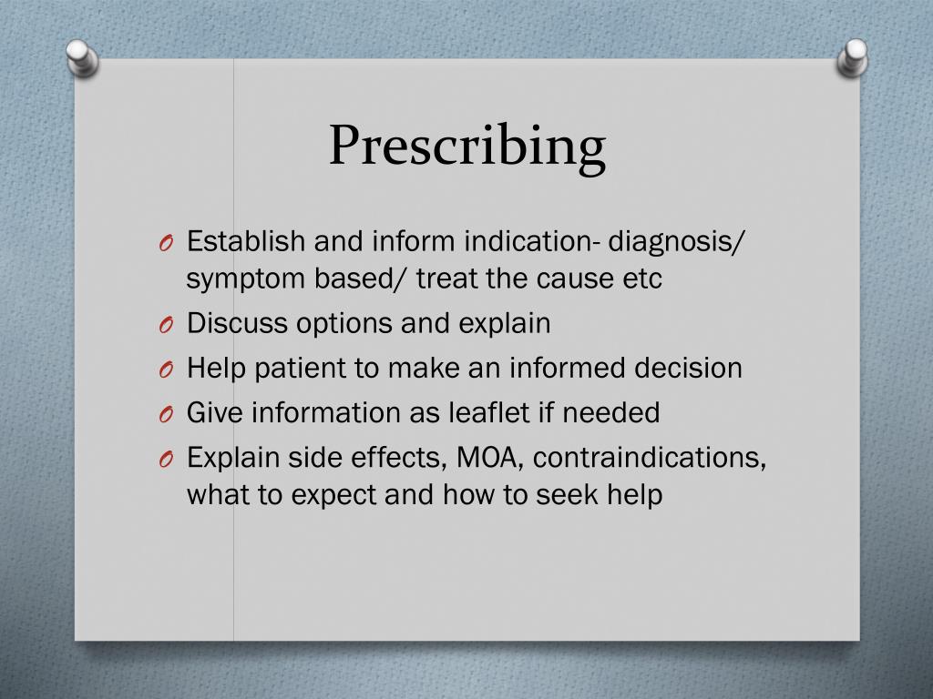 Prescribing • Establish and inform indication- diagnosis/ symptom based/ treat the cause etc • Discuss options and explain • Help patient to make an informed decision • Give information as leaflet if needed • Explain side effects, MOA, contraindications, what to expect and how to seek help