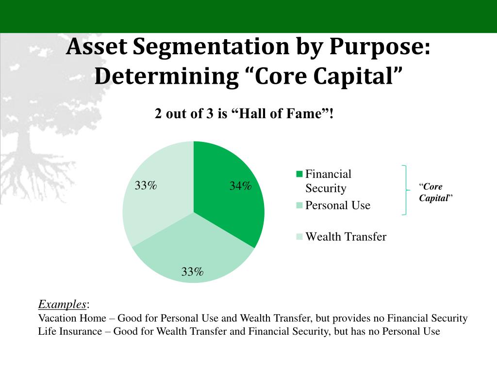 Asset Segmentation by Purpose:Determining “Core Capital” “Core Capital” Examples: Vacation Home – Good for Personal Use and Wealth Transfer, but provides no Financial Security Life Insurance – Good for Wealth Transfer and Financial Security, but has no Personal Use