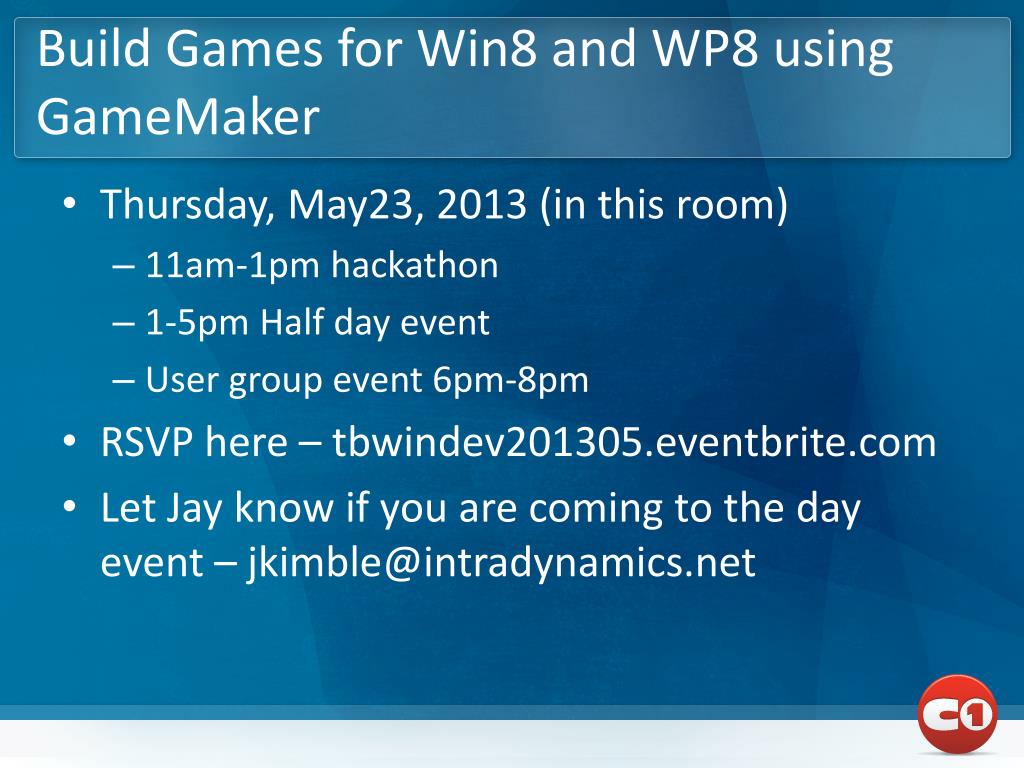 Build Games for Win8 and WP8 using GameMaker • Thursday, May23, 2013 (in this room) • 11am-1pm hackathon • 1-5pm Half day event • User group event 6pm-8pm • RSVP here – tbwindev201305.eventbrite.com • Let Jay know if you are coming to the day event – jkimble@intradynamics.net