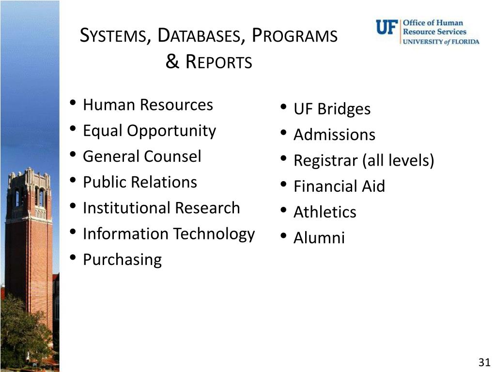 Systems, Databases, Programs & Reports • Human Resources • Equal Opportunity • General Counsel • Public Relations • Institutional Research • Information Technology • Purchasing • UF Bridges • Admissions • Registrar (all levels) • Financial Aid • Athletics • Alumni 31