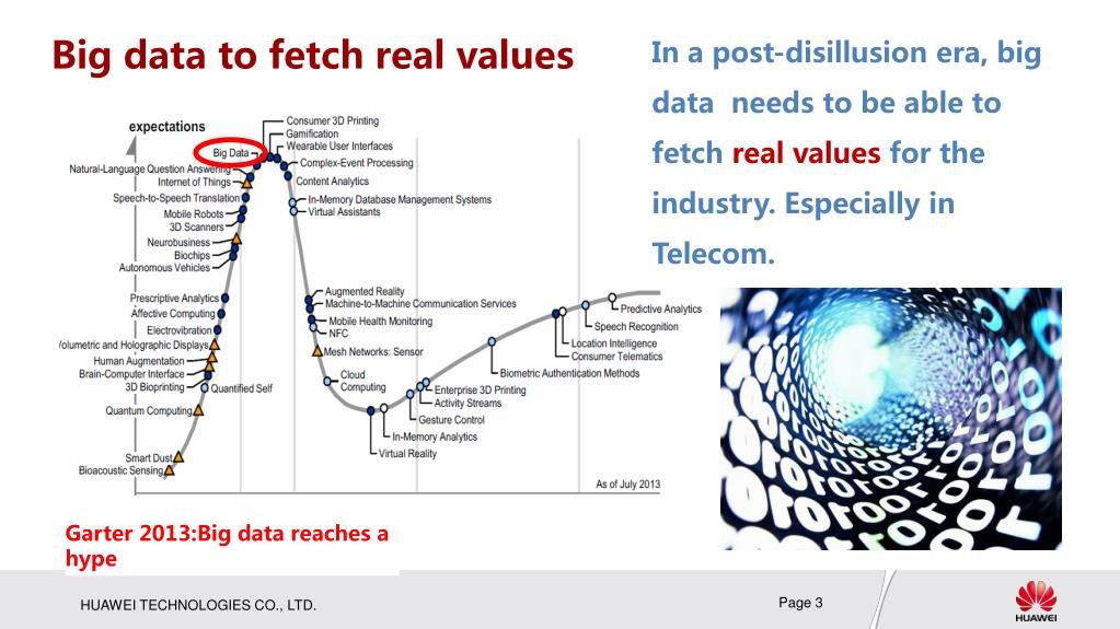 In a post-disillusion era, big data needs to be able to fetch real values for the industry. Especially in Telecom. Big data to fetch real values Garter 2013:Big data reaches a hype