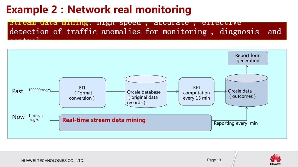 Example 2:Network real monitoring Stream data mining: high-speed , accurate , effective detection of traffic anomalies for monitoring , diagnosis and control. Report form generation Orcaledata (outcomes) Orcaledatabase (original data records) ETL (Format conversion) KPI computation every 15 min Past 100000msg/s Now 1 million msg/s Real-time stream data mining Reporting every min