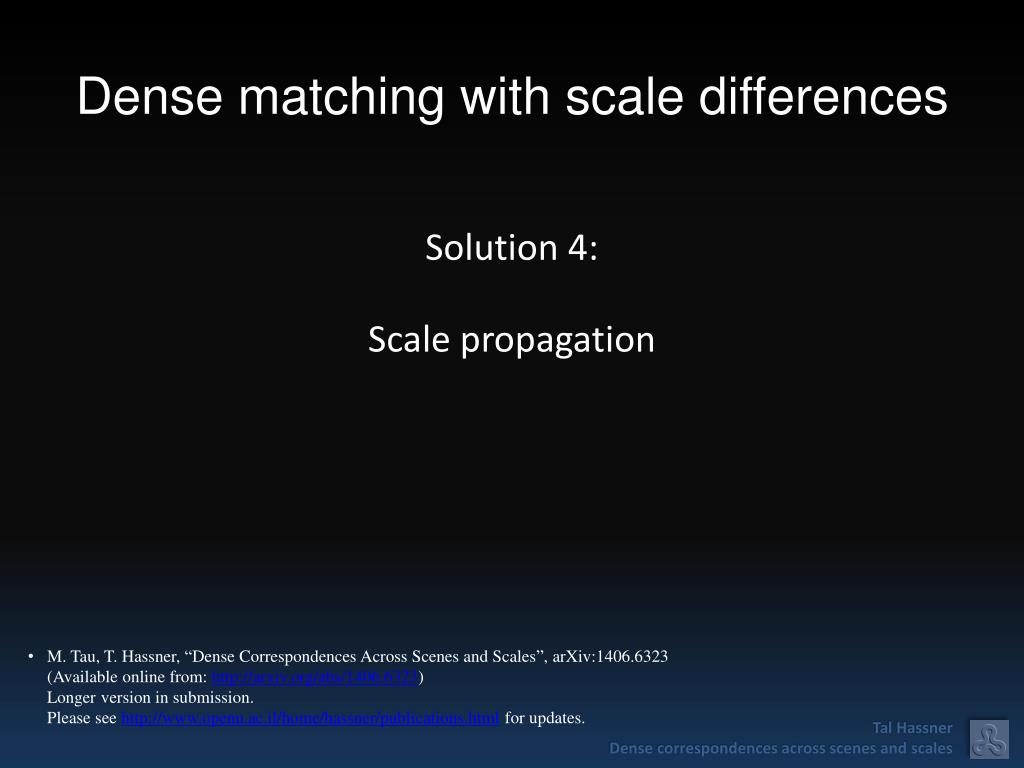 Dense matching with scale differences Solution 4: Scale propagation • M. Tau, T. Hassner, “Dense Correspondences Across Scenes and Scales”, arXiv:1406.6323 (Available online from: http://arxiv.org/abs/1406.6323) Longer version in submission. Please see http://www.openu.ac.il/home/hassner/publications.html for updates.