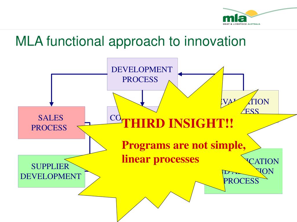 MLA functional approach to innovation DEVELOPMENT PROCESS EVALUATION PROCESS SALES CONSULTATION THIRD INSIGHT!! Programs are not simple, linear processes PROCESS PROCESS COMMUNICATION SUPPLIER PROJECT PROJECT AND ADOPTION DEVELOPMENT MANAGEMENT PROCESS PROCESS