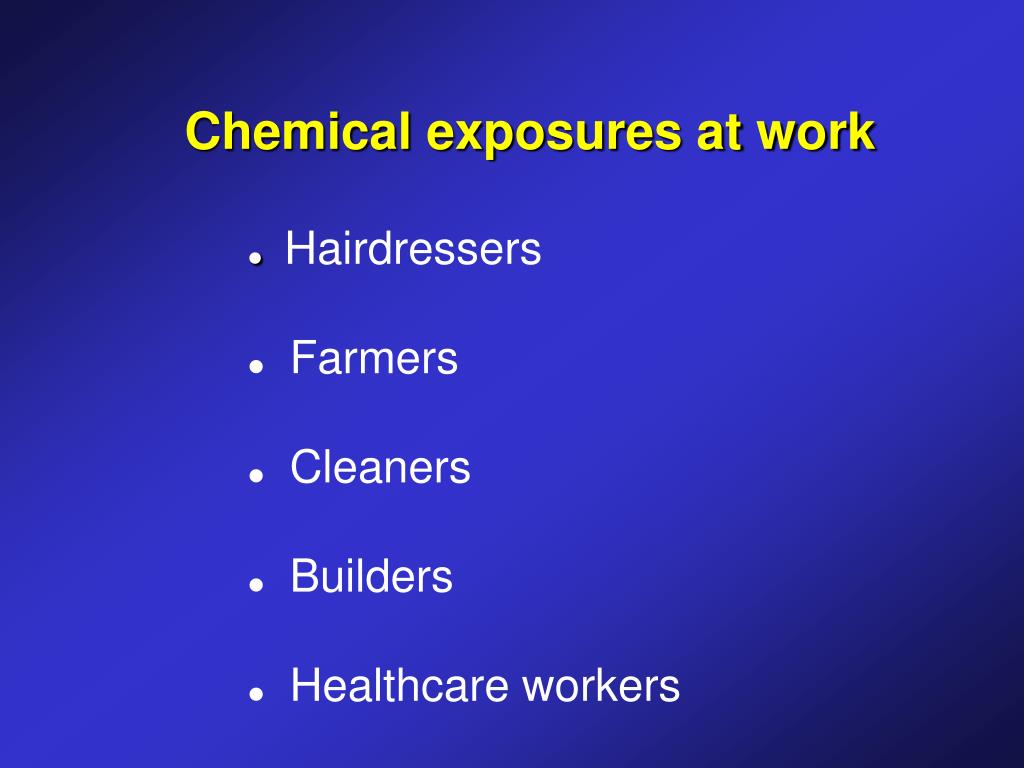 Chemical exposures at work • Hairdressers • Farmers • Cleaners • Builders • Healthcare workers