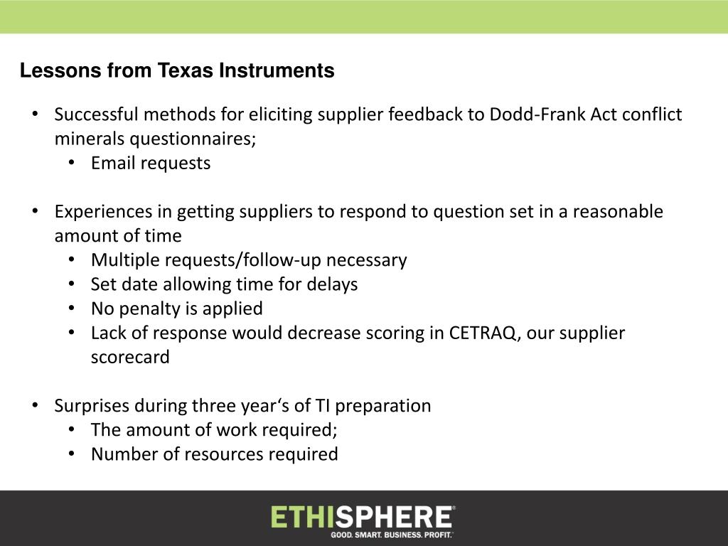 Lessons from Texas Instruments • Successful methods for eliciting supplier feedback to Dodd-Frank Act conflict minerals questionnaires; • Email requests • Experiences in getting suppliers to respond to question set in a reasonable amount of time • Multiple requests/follow-up necessary • Set date allowing time for delays • No penalty is applied • Lack of response would decrease scoring in CETRAQ, our supplier scorecard • Surprises during three year‘s of TI preparation • The amount of work required; • Number of resources required