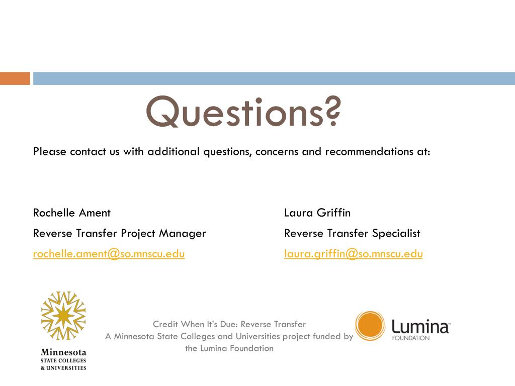 Questions? Please contact us with additional questions, concerns and recommendations at: Rochelle Ament Laura Griffin Reverse Transfer Project Manager Reverse Transfer Specialist rochelle.ament@so.mnscu.edulaura.griffin@so.mnscu.edu Credit When It’s Due: Reverse Transfer A Minnesota State Colleges and Universities project funded by the Lumina Foundation
