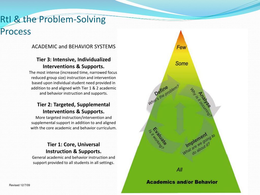 RtI & the Problem-Solving Process ACADEMIC and BEHAVIOR SYSTEMS Tier 3: Intensive, Individualized Interventions & Supports. The most intense (increased time, narrowed focus, reduced group size) instruction and intervention based upon individual student need provided in addition to and aligned with Tier 1 & 2 academic and behavior instruction and supports.Tier 2: Targeted, Supplemental Interventions & Supports. More targeted instruction/intervention and supplemental support in addition to and aligned with the core academic and behavior curriculum. Tier 1: Core, Universal Instruction & Supports. General academic and behavior instruction and support provided to all students in all settings. Revised 12/7/09