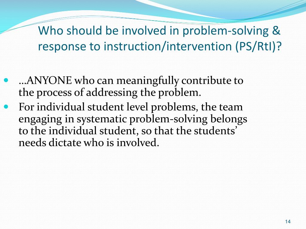 Who should be involved in problem-solving & response to instruction/intervention (PS/RtI)? …ANYONE who can meaningfully contribute to the process of addressing the problem. For individual student level problems, the team engaging in systematic problem-solving belongs to the individual student, so that the students’ needs dictate who is involved.