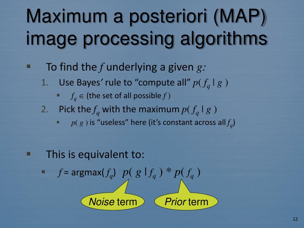 Maximum a posteriori (MAP) image processing algorithms • To find the f underlying a given g: • Use Bayes’rule to “compute all”p( fq| g ) • fq (the set of all possible f ) • Pick the fq with the maximum p( fq| g ) • p( g )is “useless” here (it’s constant across all fq) • This is equivalent to: • f = argmax( fq) p( g | fq) * p( fq) Noise term Prior term