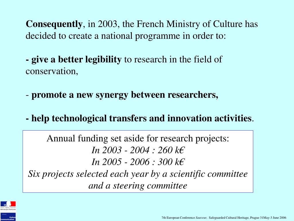 Consequently, in 2003, the French Ministry of Culture has decided to create a national programme in order to: • - give a better legibility to research in the field of conservation, • promote a new synergy between researchers, • - help technological transfers and innovation activities. Annual funding set aside for research projects: In 2003 - 2004 : 260 k€ In 2005 - 2006 : 300 k€ Six projects selected each year by a scientific committee and a steering committee 7th European Conference Sauveur, Safeguarded Cultural Heritage, Prague 31May-3 June 2006