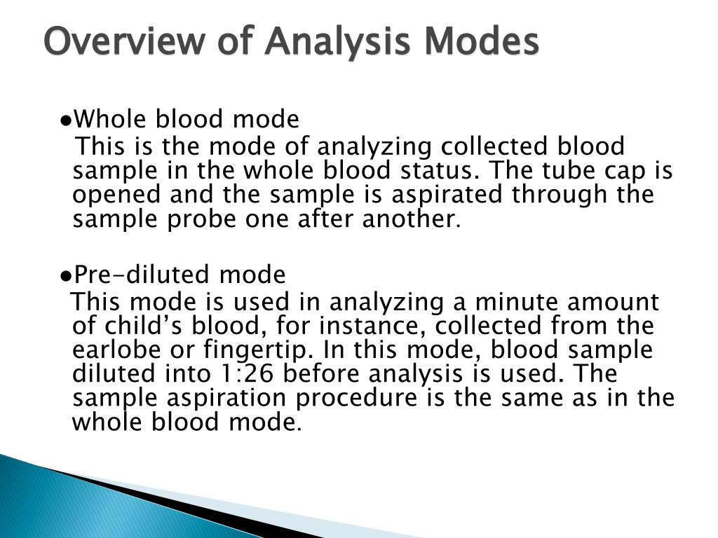 Overview of Analysis Modes ● Whole blood mode This is the mode of analyzing collected blood sample in the whole blood status. The tube cap is opened and the sample is aspirated through the sample probe one after another. ● Pre-diluted mode This mode is used in analyzing a minute amount of child’s blood, for instance, collected from the earlobe or fingertip. In this mode, blood sample diluted into 1:26 before analysis is used. The sample aspiration procedure is the same as in the whole blood mode.