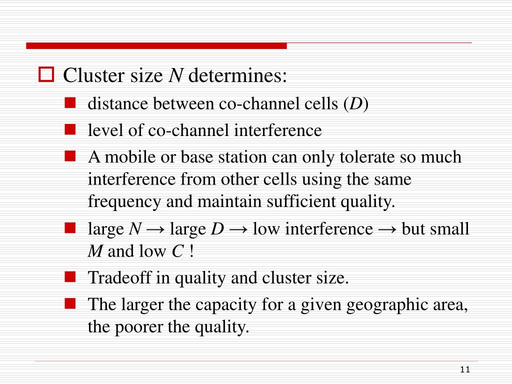 Cluster size N determines: • distance between co-channel cells (D) • level of co-channel interference • A mobile or base station can only tolerate so much interference from other cells using the same frequency and maintain sufficient quality. • large N → large D → low interference → but small M and low C ! • Tradeoff in quality and cluster size. • The larger the capacity for a given geographic area, the poorer the quality.