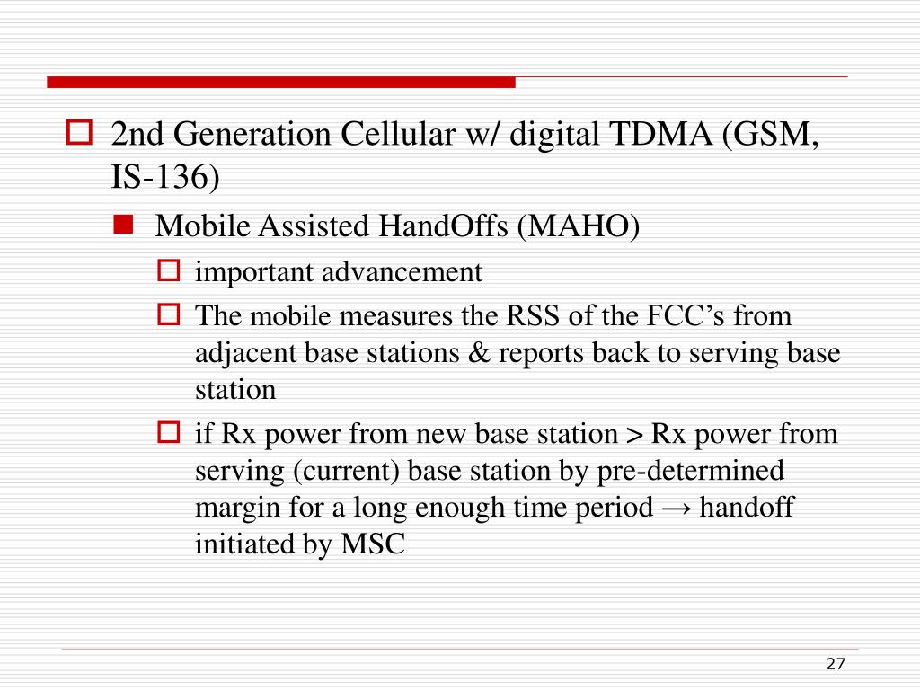 2nd Generation Cellular w/ digital TDMA (GSM, IS-136) • Mobile Assisted HandOffs (MAHO) • important advancement • The mobilemeasures the RSS of the FCC’s from adjacent base stations & reports back to serving base station • if Rx power from new base station > Rx power from serving (current) base station by pre-determined margin for a long enough time period → handoff initiated by MSC