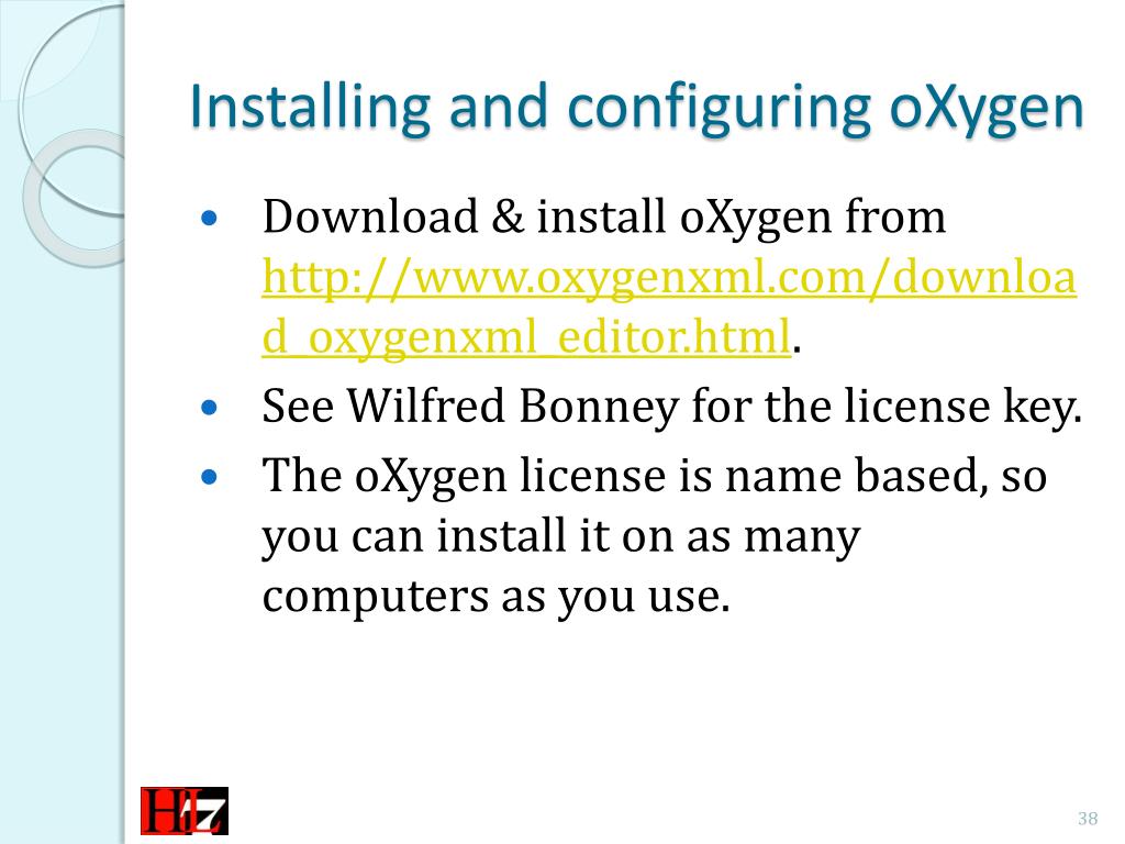 Installing and configuring oXygen • Download & install oXygen from http://www.oxygenxml.com/download_oxygenxml_editor.html. • See Wilfred Bonney for the license key. • The oXygen license is name based, so you can install it on as many computers as you use.