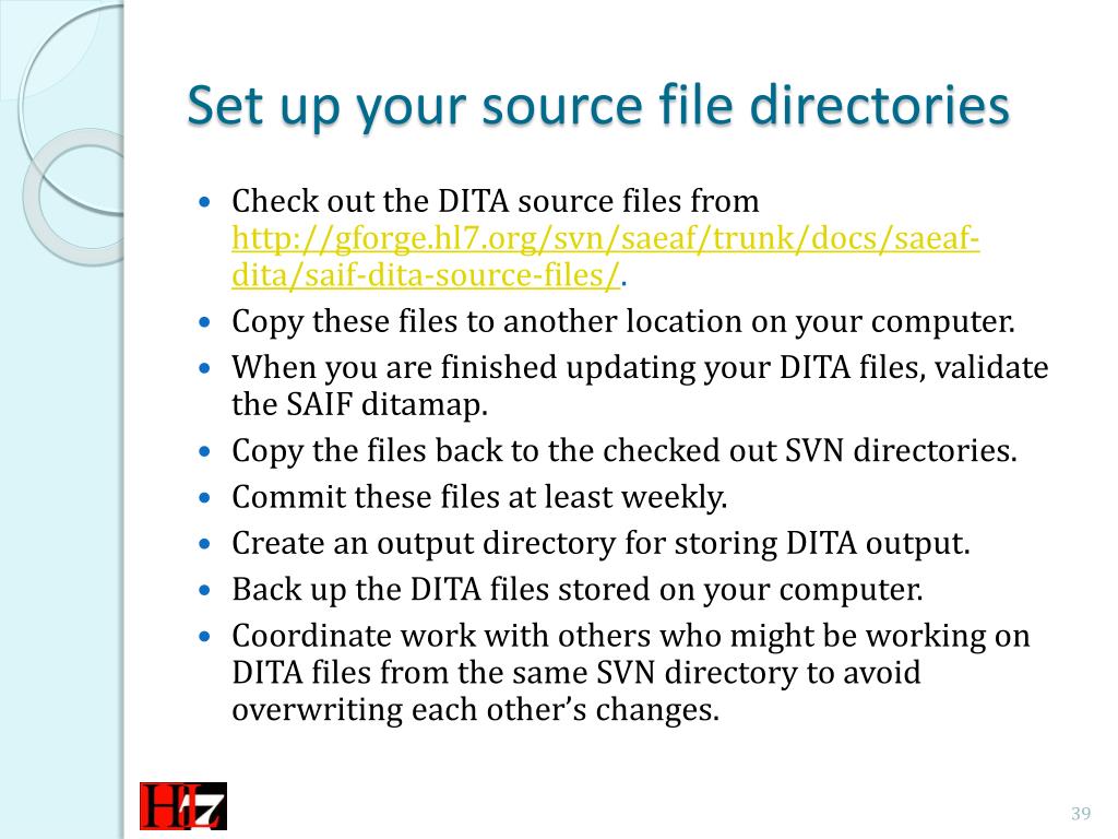 Set up your source file directories • Check out the DITA source files from http://gforge.hl7.org/svn/saeaf/trunk/docs/saeaf-dita/saif-dita-source-files/. • Copy these files to another location on your computer. • When you are finished updating your DITA files, validate the SAIF ditamap. • Copy the files back to the checked out SVN directories. • Commit these files at least weekly. • Create an output directory for storing DITA output. • Back up the DITA files stored on your computer. • Coordinate work with others who might be working on DITA files from the same SVN directory to avoid overwriting each other’s changes.