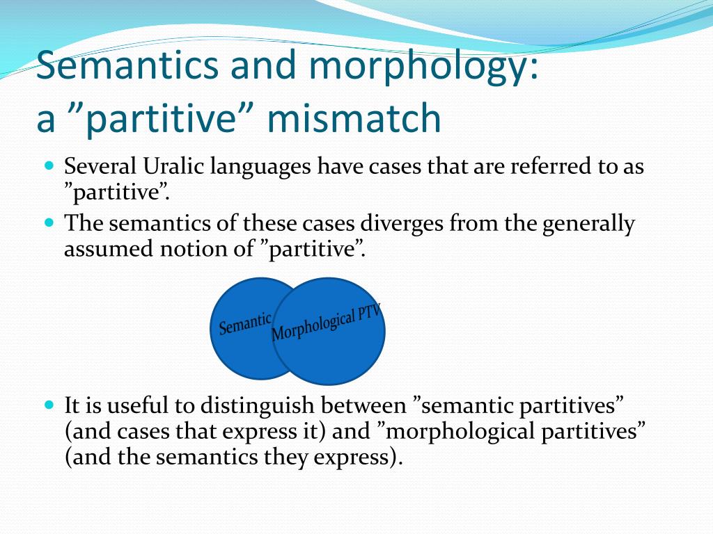 Semantics and morphology: a ”partitive” mismatch • SeveralUraliclanguageshavecasesthatarereferredtoas ”partitive”. • The semantics of thesecasesdivergesfromthegenerallyassumednotionof ”partitive”. • It is usefultodistinguishbetween ”semanticpartitives” (and casesthatexpressit) and ”morphologicalpartitives” (andthesemanticstheyexpress). Semantic Morphological PTV