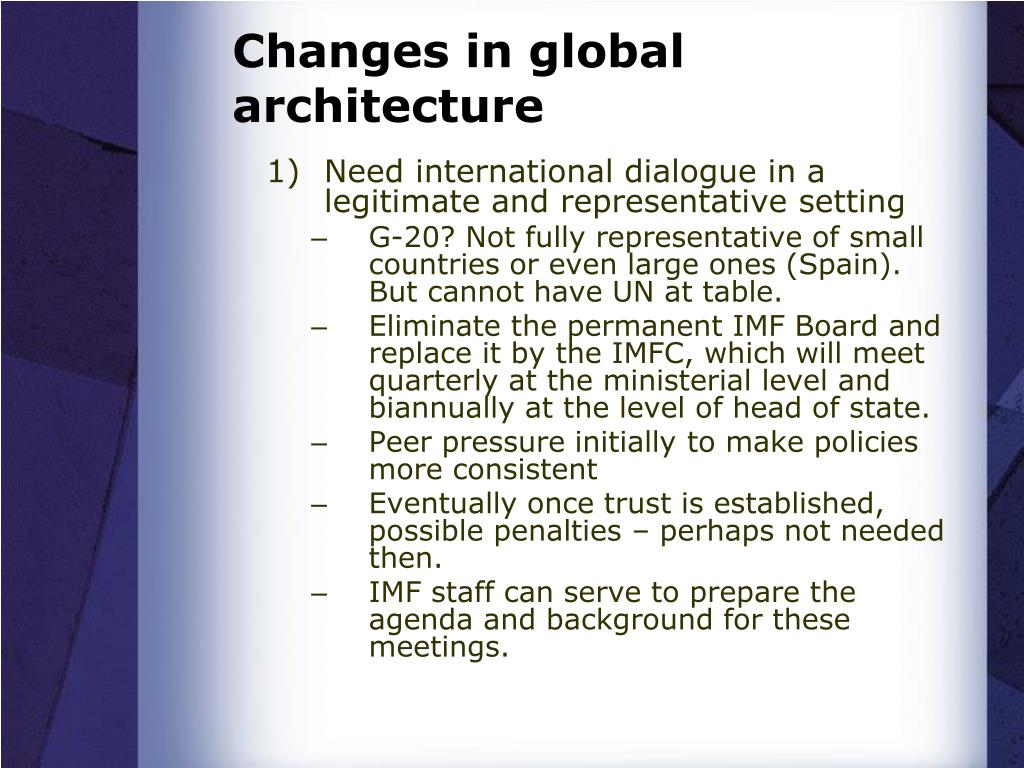 Changes in global architecture • Need international dialogue in a legitimate and representative setting • G-20? Not fully representative of small countries or even large ones (Spain). But cannot have UN at table. • Eliminate the permanent IMF Board and replace it by the IMFC, which will meet quarterly at the ministerial level and biannually at the level of head of state. • Peer pressure initially to make policies more consistent • Eventually once trust is established, possible penalties – perhaps not needed then. • IMF staff can serve to prepare the agenda and background for these meetings.