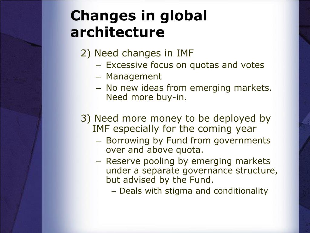 Changes in global architecture 2) Need changes in IMF • Excessive focus on quotas and votes • Management • No new ideas from emerging markets. Need more buy-in. 3) Need more money to be deployed by IMF especially for the coming year • Borrowing by Fund from governments over and above quota. • Reserve pooling by emerging markets under a separate governance structure, but advised by the Fund. • Deals with stigma and conditionality