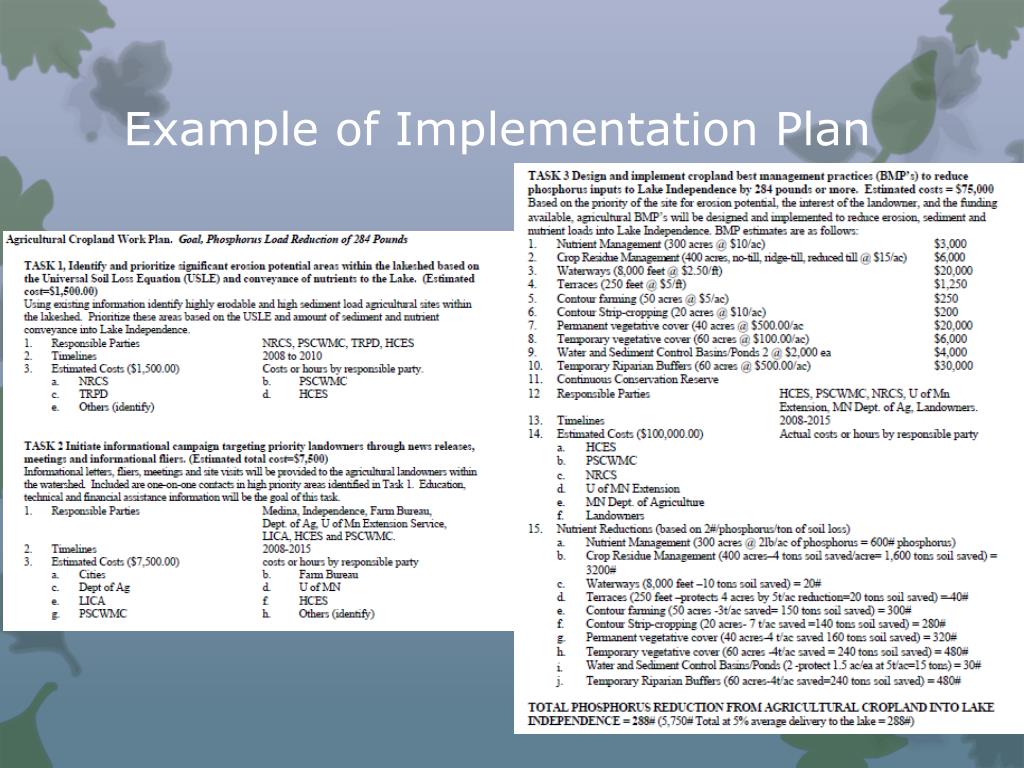 Implementation • Reducing movement of phosphorus into Lake Independence. • 45% reduction (1081lbs/yr) • 872 lbs/yr decrease from each identified external source • 209 lbs/yr decrease of internal loading due to reduction of external sources.