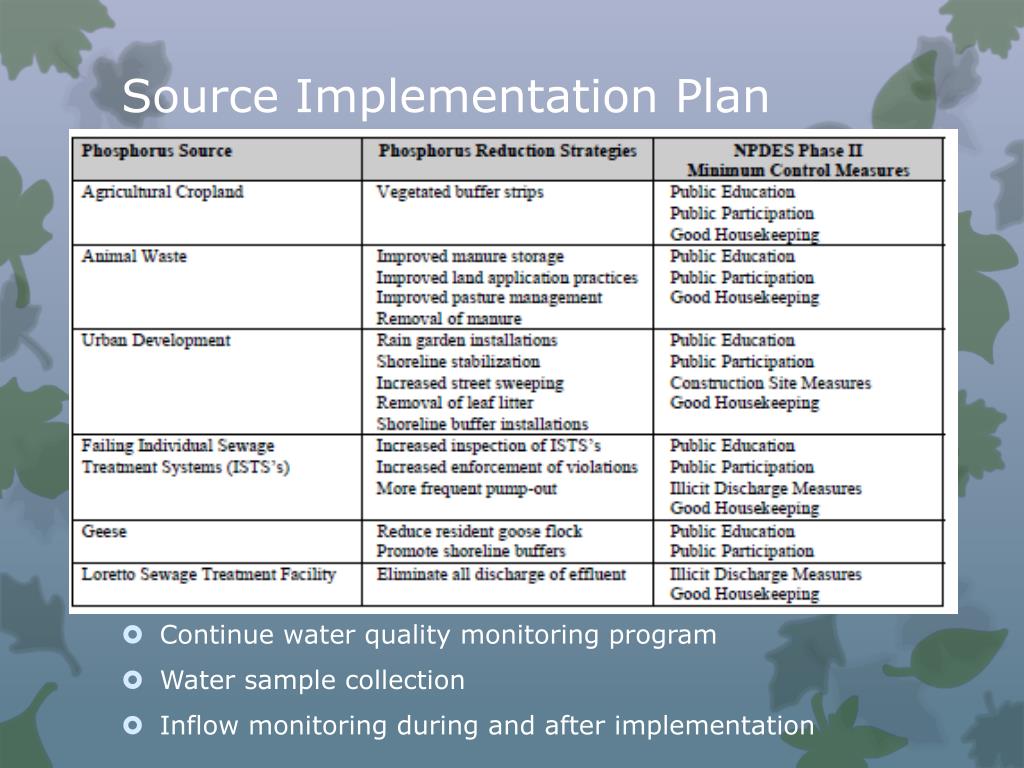 Source Implementation Plan • Continue water quality monitoring program • Water sample collection • Inflow monitoring during and after implementation
