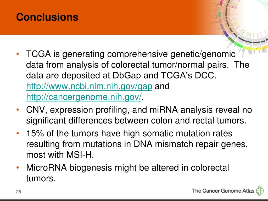 Conclusions TCGA is generating comprehensive genetic/genomic data from analysis of colorectal tumor/normal pairs. The data are deposited at DbGap and TCGA’s DCC. http://www.ncbi.nlm.nih.gov/gap and http://cancergenome.nih.gov/. CNV, expression profiling, and miRNA analysis reveal no significant differences between colon and rectal tumors. 15% of the tumors have high somatic mutation rates resulting from mutations in DNA mismatch repair genes, most with MSI-H. MicroRNA biogenesis might be altered in colorectal tumors.