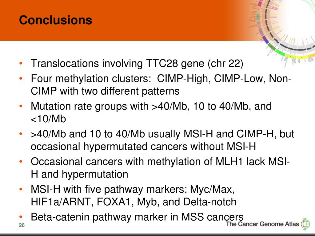 Conclusions Translocations involving TTC28 gene (chr 22) Four methylation clusters: CIMP-High, CIMP-Low, Non-CIMP with two different patterns Mutation rate groups with >40/Mb, 10 to 40/Mb, and <10/Mb >40/Mb and 10 to 40/Mb usually MSI-H and CIMP-H, but occasional hypermutated cancers without MSI-H Occasional cancers with methylation of MLH1 lack MSI-H and hypermutation MSI-H with five pathway markers: Myc/Max, HIF1a/ARNT, FOXA1, Myb, and Delta-notch Beta-catenin pathway marker in MSS cancers