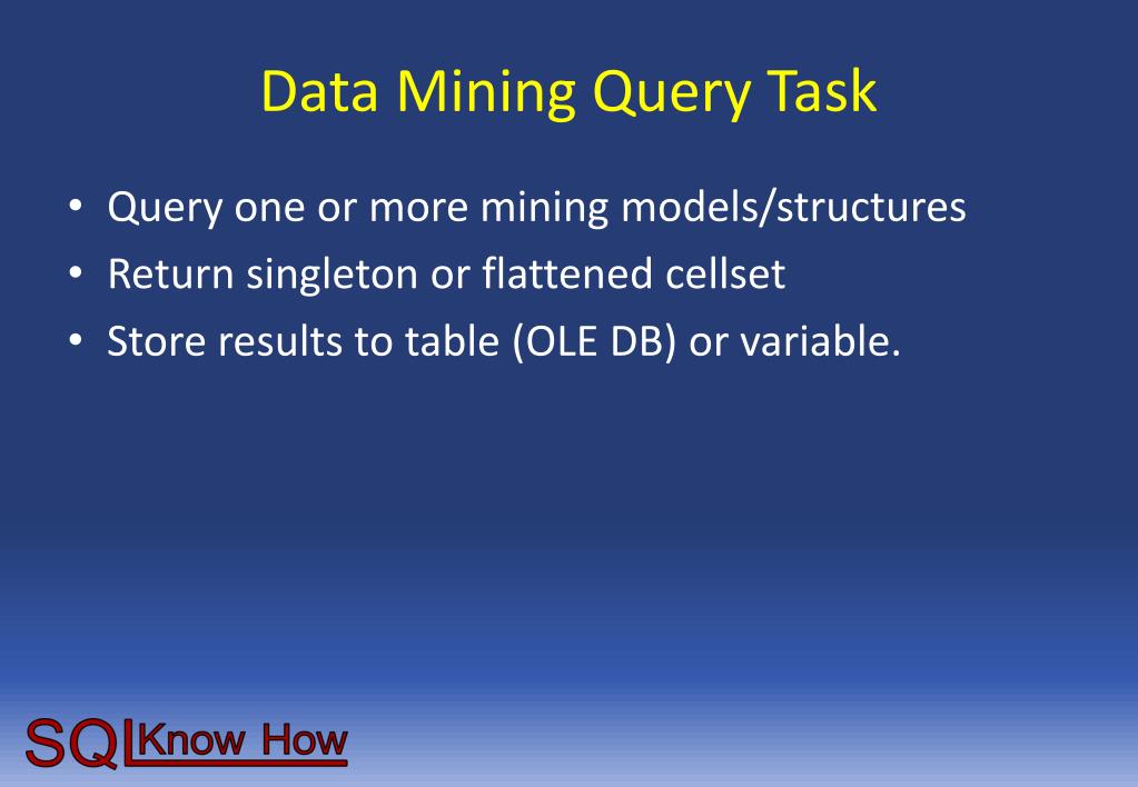 Data Mining Query Task • Query one or more mining models/structures • Return singleton or flattened cellset • Store results to table (OLE DB) or variable.