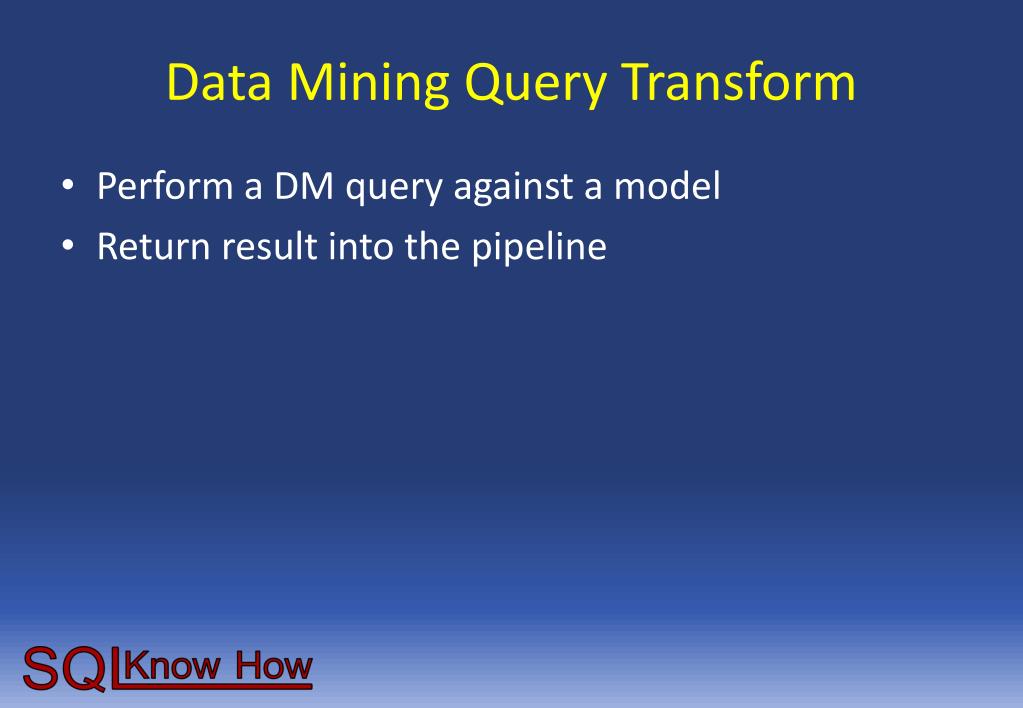 Data Mining Query Transform • Perform a DM query against a model • Return result into the pipeline