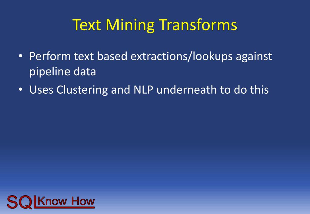 Text Mining Transforms • Perform text based extractions/lookups against pipeline data • Uses Clustering and NLP underneath to do this