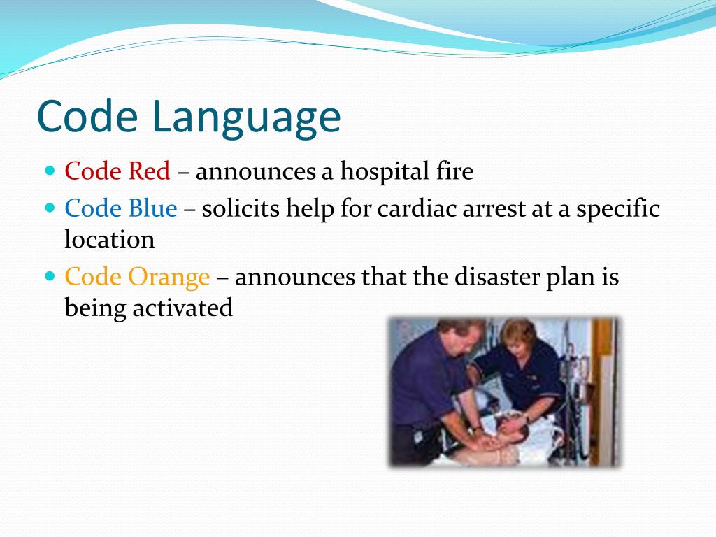 Code Language • Code Red – announces a hospital fire • Code Blue – solicits help for cardiac arrest at a specific location • Code Orange – announces that the disaster plan is being activated