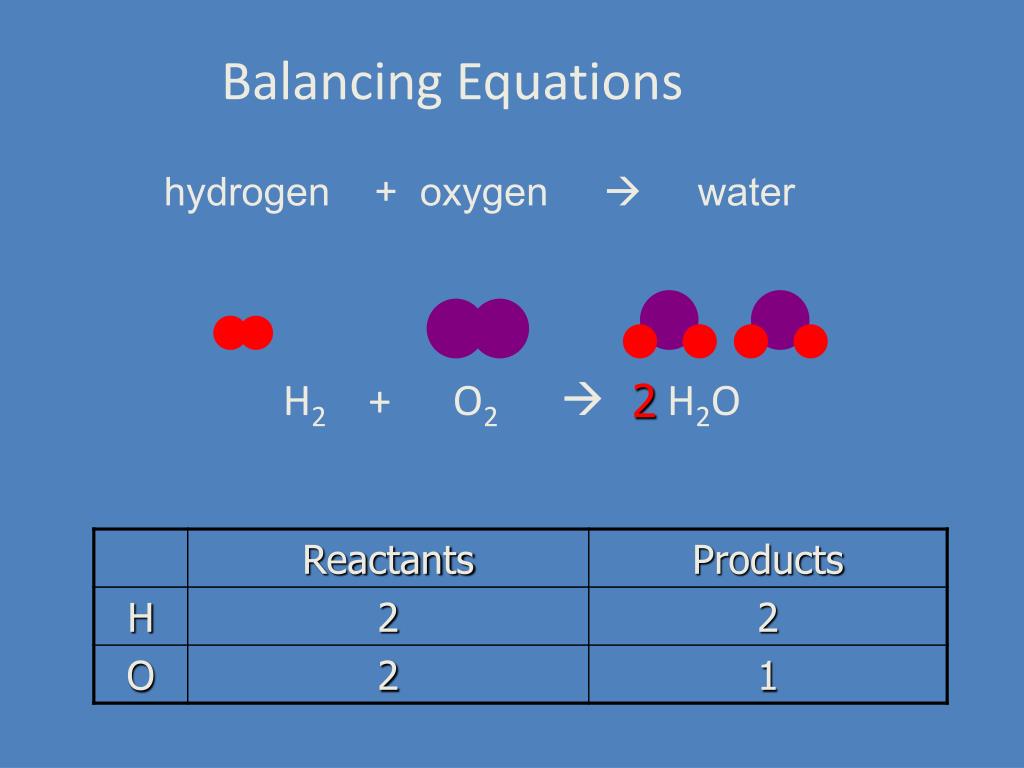 Balancing Equations hydrogen + oxygen water H2 + O2 H2O 2