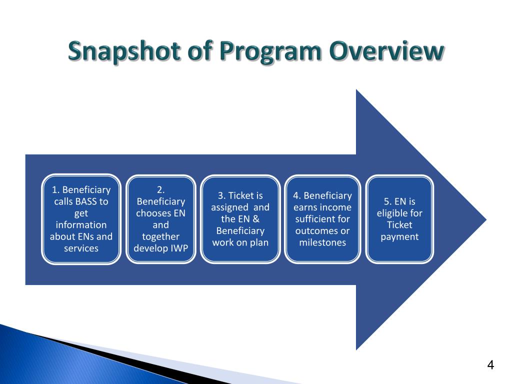 What is the Ticket to Work Program? • A Social Security Administration Program • Established through the signing of legislation in December 1999, The Ticket to Work and Work Incentives Improvement Act • Provides payments to participating Employment Networks for assisting Social Security beneficiary’s in becoming more self-sufficient through employment