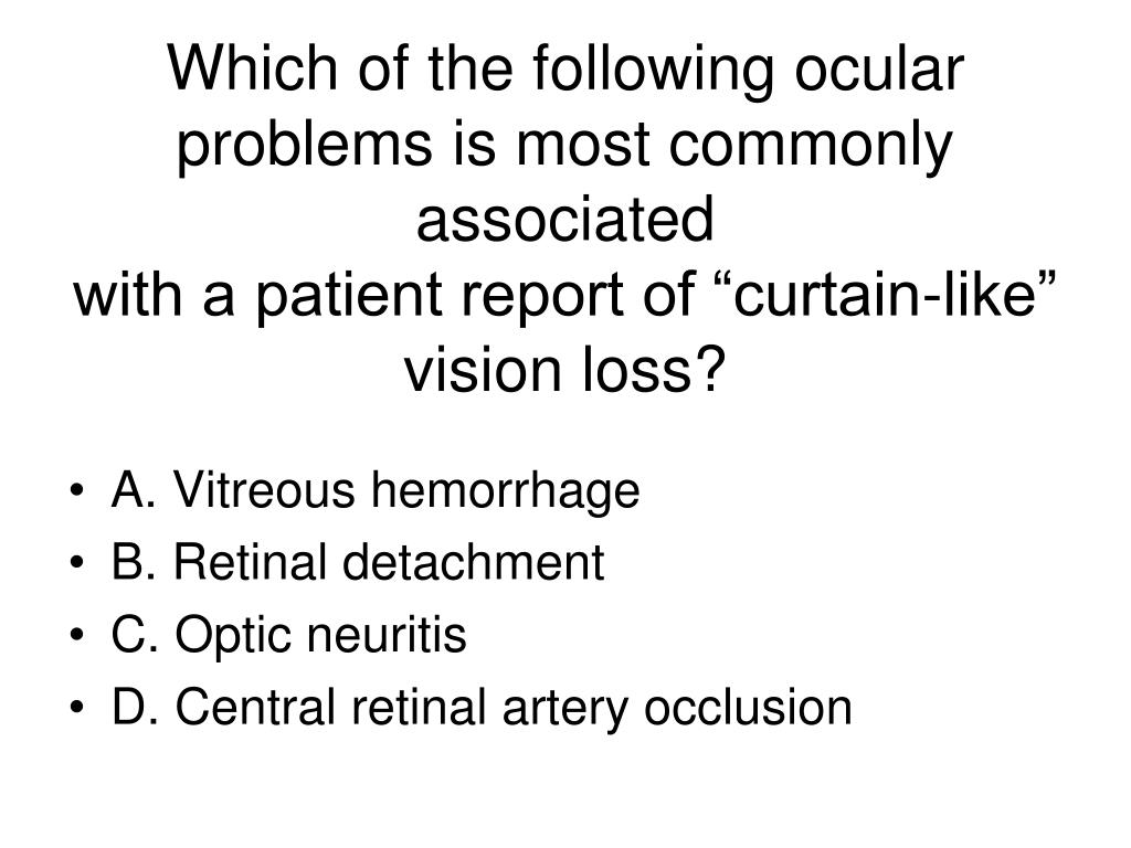 Which of the following ocular problems is most commonly associatedwith a patient report of “curtain-like” vision loss? • A. Vitreous hemorrhage • B. Retinal detachment • C. Optic neuritis • D. Central retinal artery occlusion