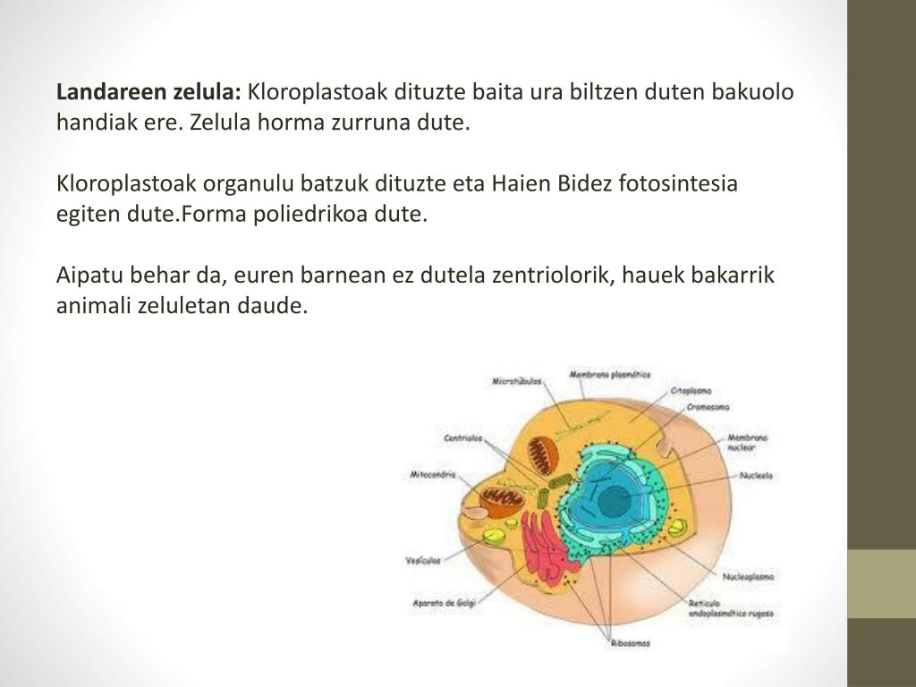 Landareen zelula: Kloroplastoak dituzte baita ura biltzen duten bakuolo handiak ere. Zelula horma zurruna dute. Kloroplastoak organulu batzuk dituzte eta Haien Bidez fotosintesia egiten dute.Forma poliedrikoa dute. Aipatu behar da, euren barnean ez dutela zentriolorik, hauek bakarrik animali zeluletan daude.