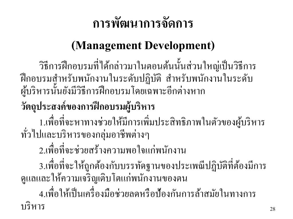 การพัฒนาการจัดการ(Management Development) วิธีการฝึกอบรมที่ได้กล่าวมาในตอนต้นนั้นส่วนใหญ่เป็นวิธีการฝึกอบรมสำหรับพนักงานในระดับปฏิบัติ สำหรับพนักงานในระดับผู้บริหารนั้นยังมีวิธีการฝึกอบรมโดยเฉพาะอีกต่างหาก วัตถุประสงค์ของการฝึกอบรมผู้บริหาร 1.เพื่อที่จะหาทางช่วยให้มีการเพิ่มประสิทธิภาพในตัวของผู้บริหารทั่วไปและบริหารของกลุ่มอาชีพต่างๆ 2.เพื่อที่จะช่วยสร้างความพอใจแก่พนักงาน 3.เพื่อที่จะให้ถูกต้องกับบรรทัดฐานของประเพณีปฏิบัติที่ต้องมีการดูแลและให้ความเจริญเติบโตแก่พนักงานของตน 4.เพื่อให้เป็นเครื่องมือช่วยลดหรือป้องกันการล้าสมัยในทางการบริหาร
