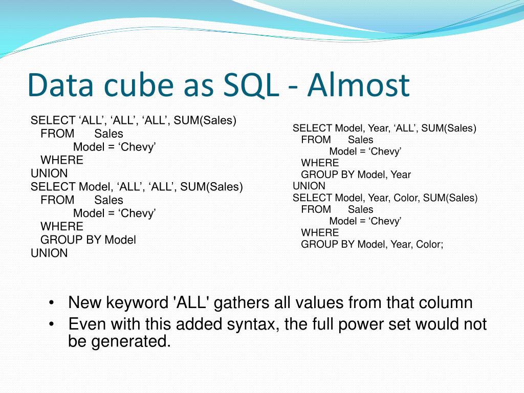 Data cube as SQL - Almost • New keyword 'ALL' gathers all values from that column • Even with this added syntax, the full power set would not be generated. SELECT ‘ALL’, ‘ALL’, ‘ALL’, SUM(Sales) FROM Sales Model = ‘Chevy’ WHEREUNIONSELECT Model, ‘ALL’, ‘ALL’, SUM(Sales) FROM Sales Model = ‘Chevy’ WHERE GROUP BY ModelUNION SELECT Model, Year, ‘ALL’, SUM(Sales) FROM Sales Model = ‘Chevy’ WHERE GROUP BY Model, YearUNION SELECT Model, Year, Color, SUM(Sales) FROM Sales Model = ‘Chevy’ WHERE GROUP BY Model, Year, Color;