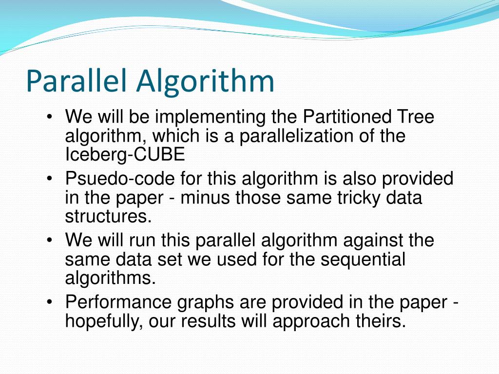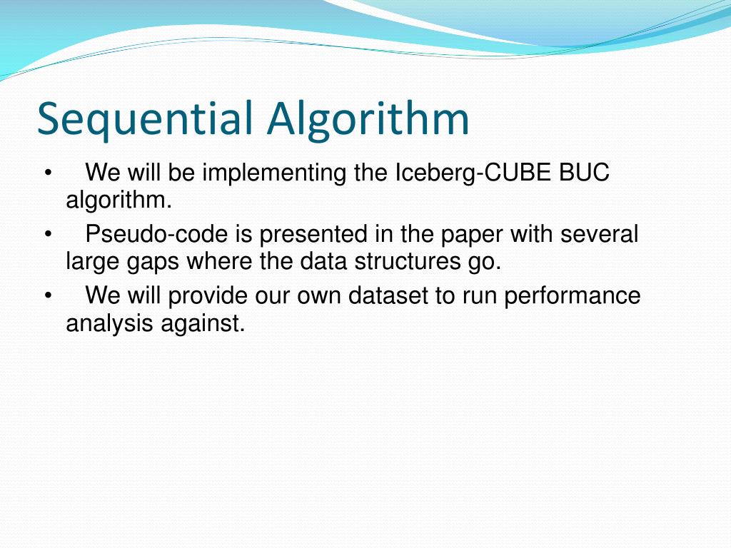 Sequential Algorithm • We will be implementing the Iceberg-CUBE BUC algorithm. • Pseudo-code is presented in the paper with several large gaps where the data structures go. • We will provide our own dataset to run performance analysis against.